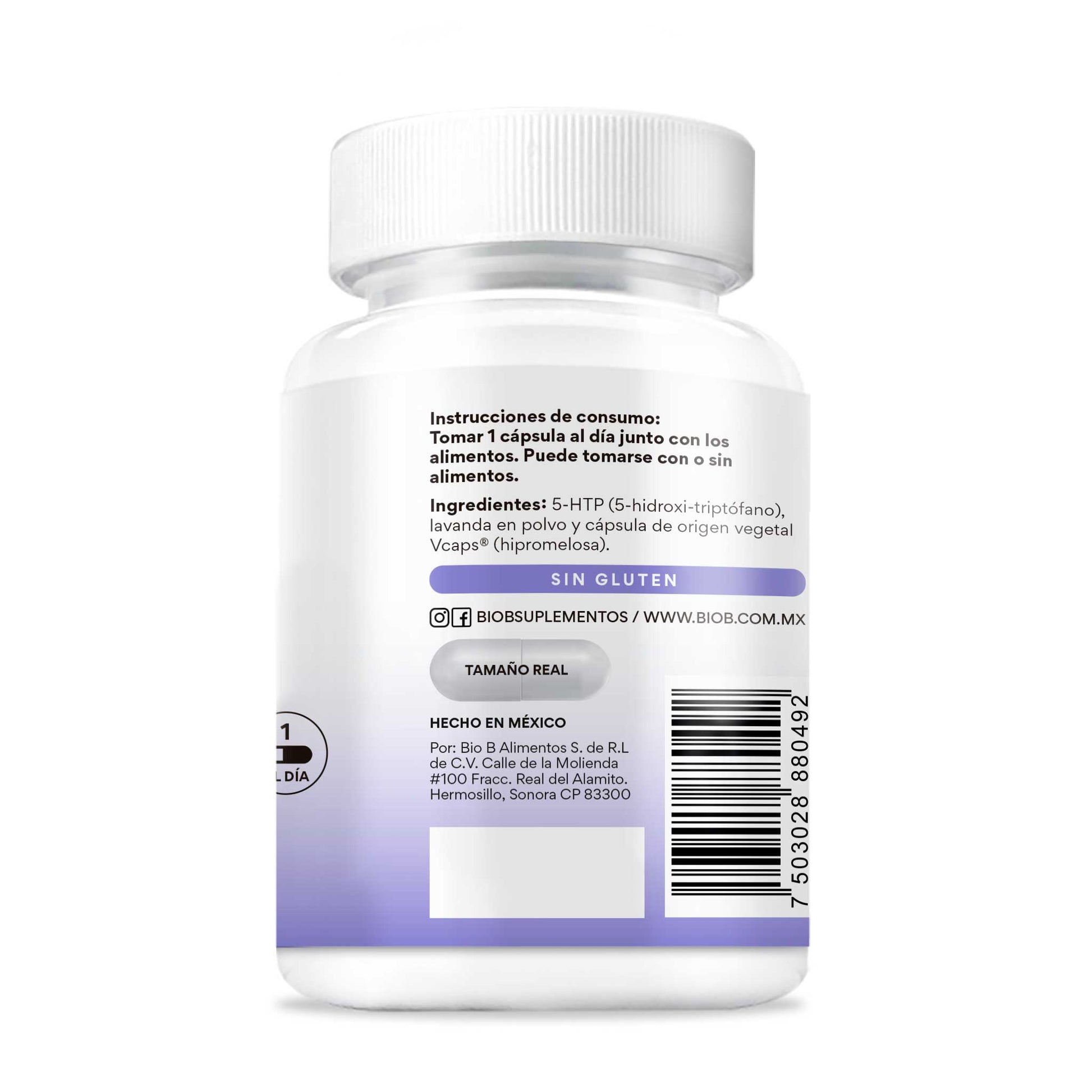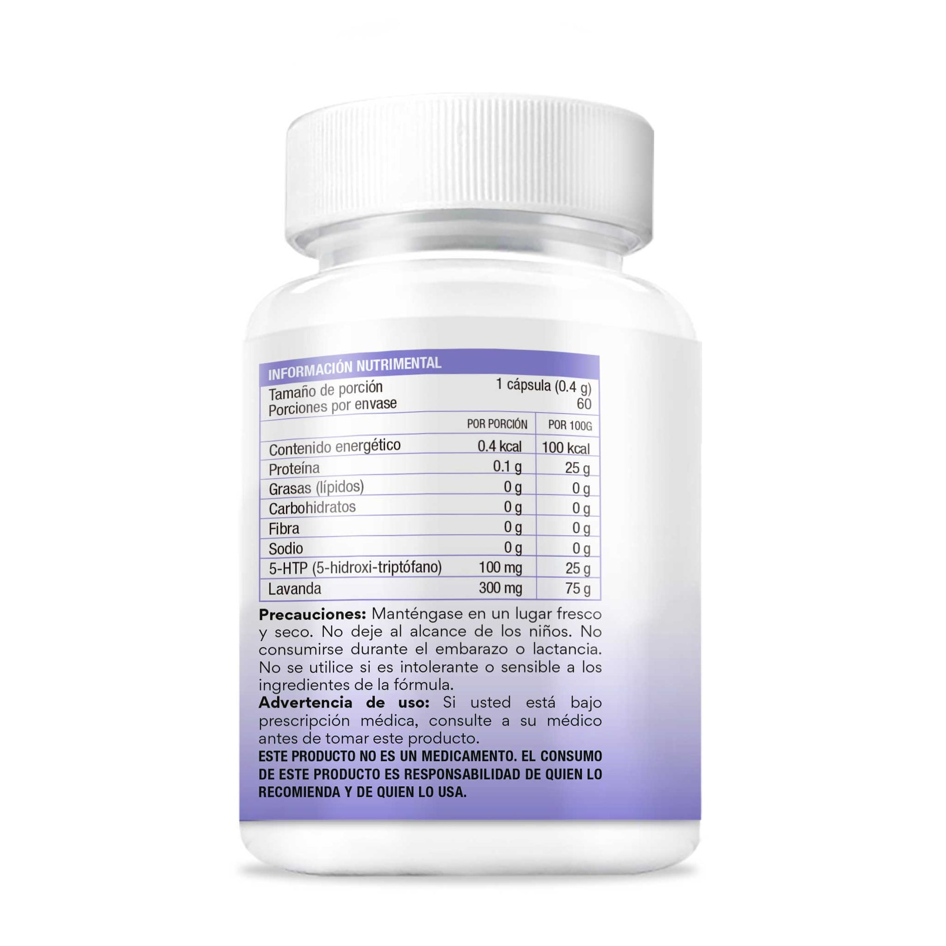 5-HTP (5-hidroxi-triptófano), lavanda en polvo y cápsula de origen vegetal Vcaps® (hipromelosa).