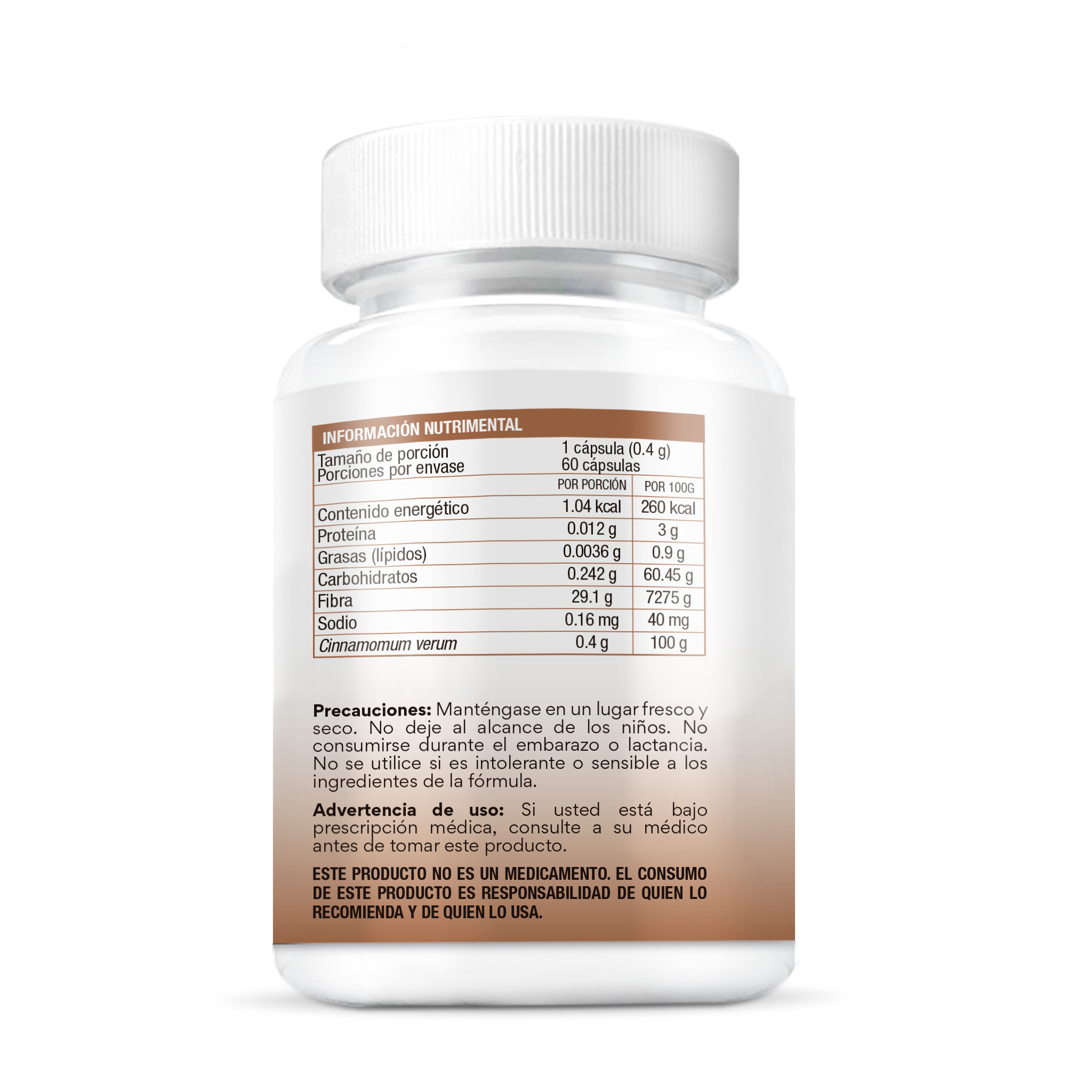 Canela en polvo (Cinnamomum verum) y cápsula de origen vegetal Vcaps® (hipromelosa).