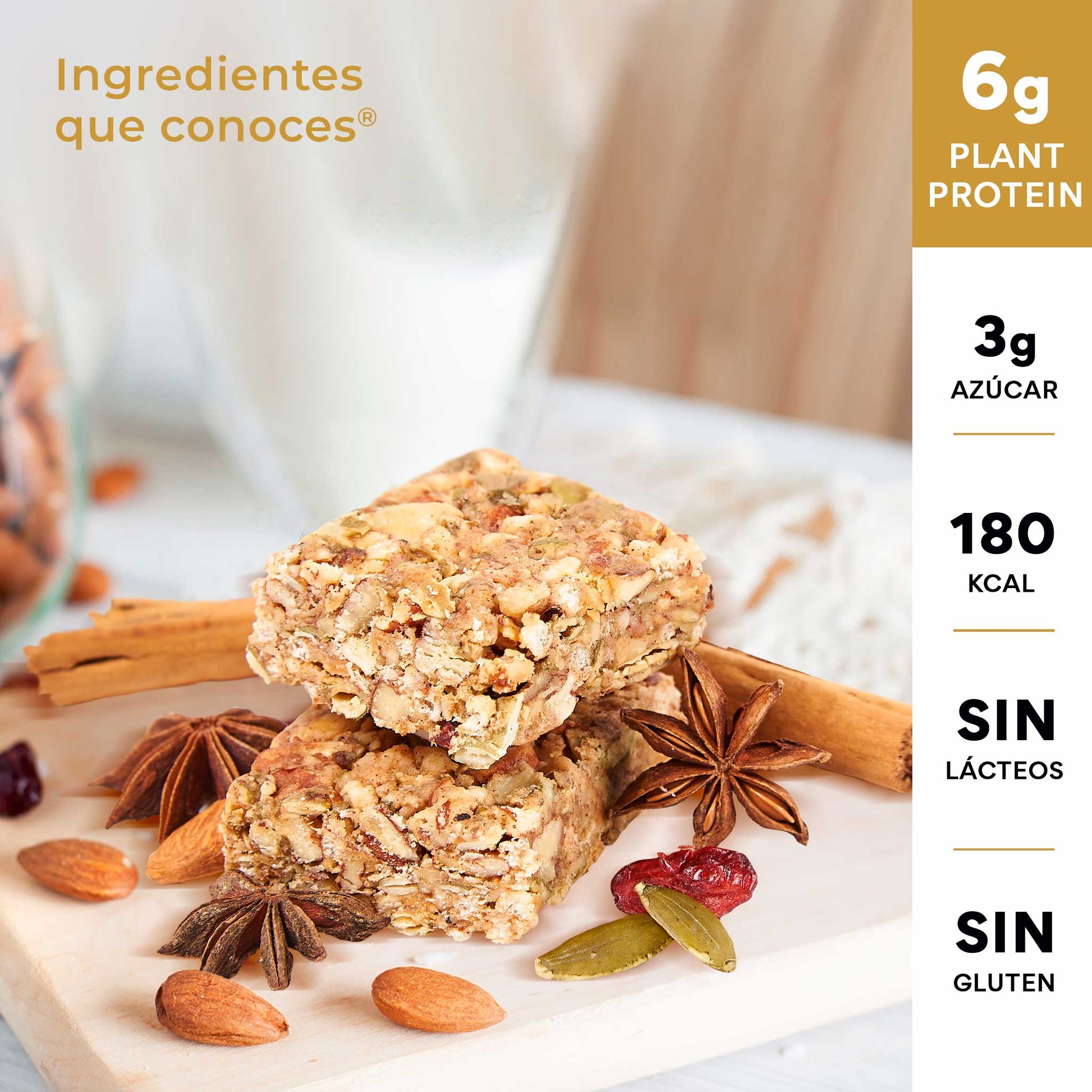 *Esta barra contiene 3g de azúcar, mientras que las barras de marcas líderes en el mercado contienen de 10 a 13g de azúcar.