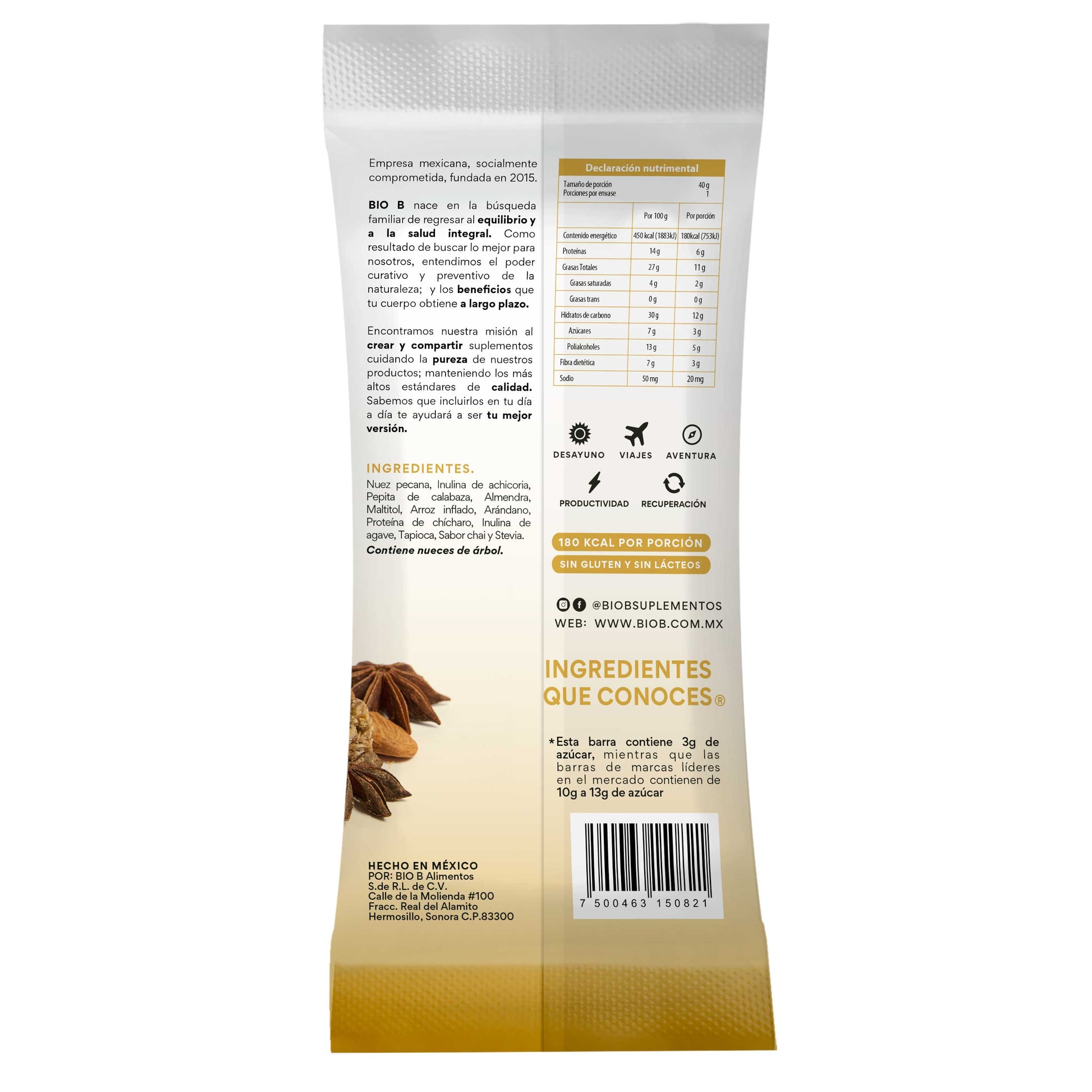 Nuez pecana, Inulina de achicoria, Pepita de calabaza, Almendra, Maltitol, Arroz inflado, Arándano, Proteína de chícharo, Inulina de agave, Tapioca, Sabor chai y Stevia.