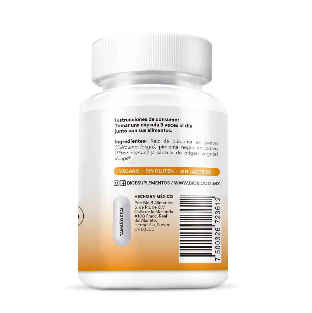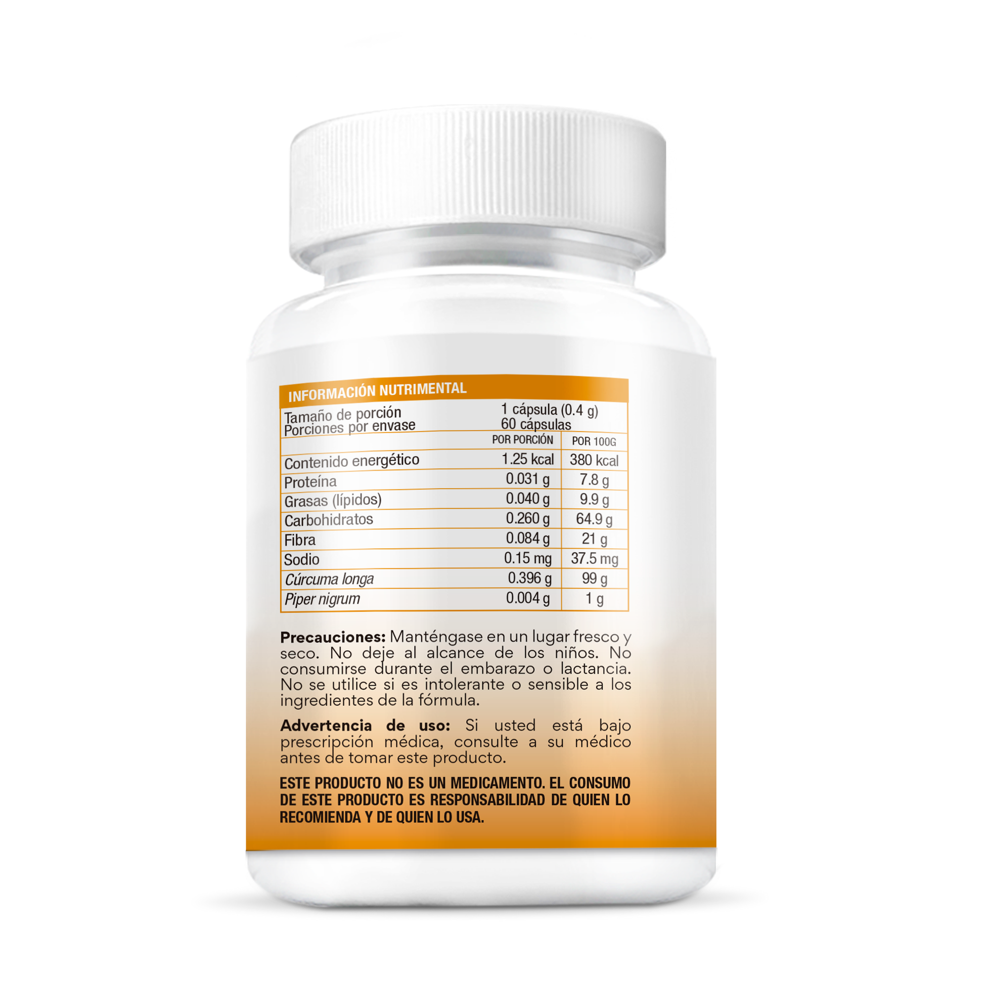 Raíz de cúrcuma en polvo (Cúrcuma longa), pimienta negra en polvo (Piper nigrum) y cápsula de origen vegetal Vcaps®.