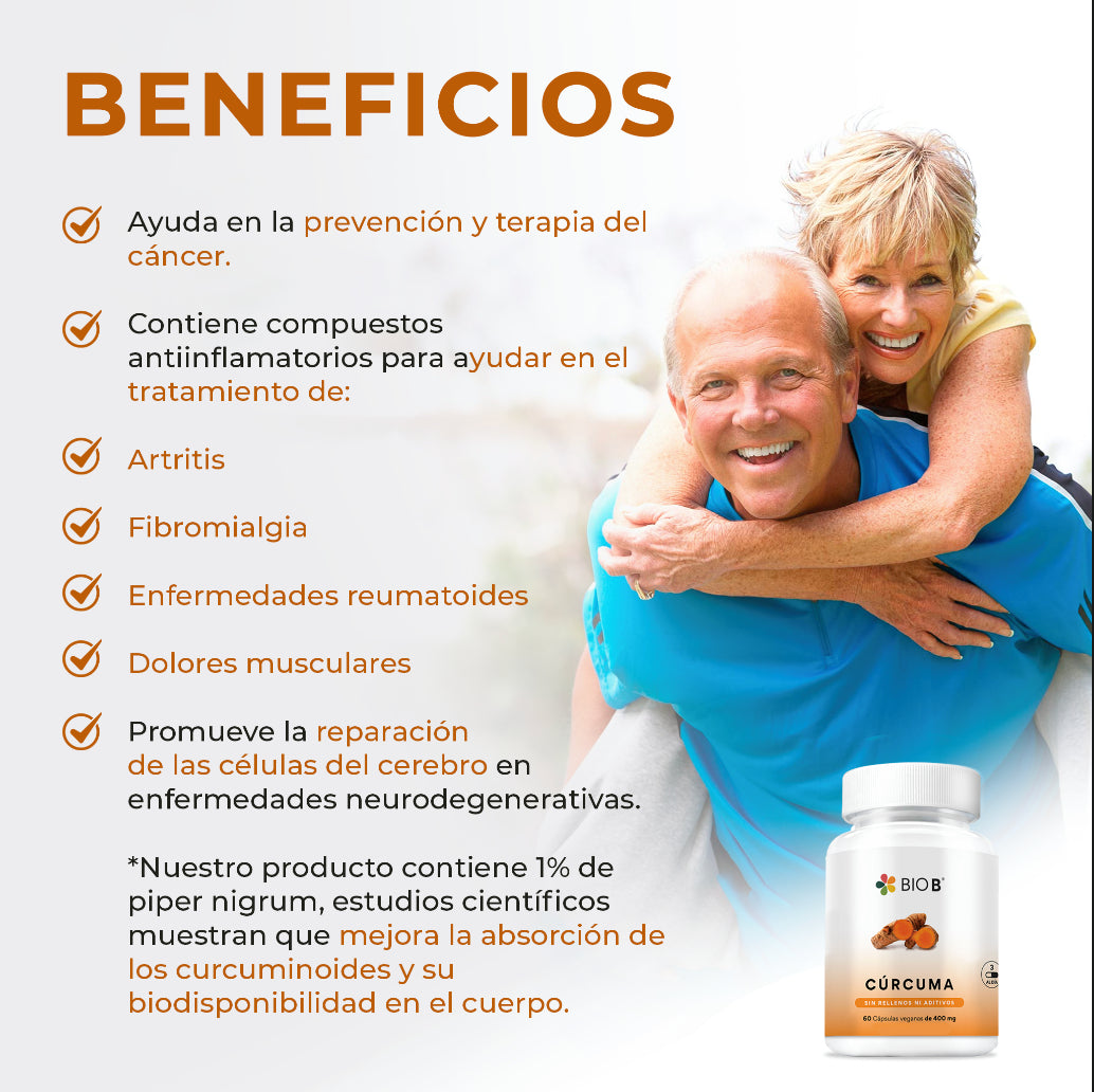 Descubre la Cúrcuma, una potente aliada en la prevención y terapia del cáncer. Sus compuestos antiinflamatorios benefician el tratamiento de condiciones como artritis, fibromialgia, enfermedades reumatoides y dolores musculares. Además, promueve la reparación celular en enfermedades neurodegenerativas.