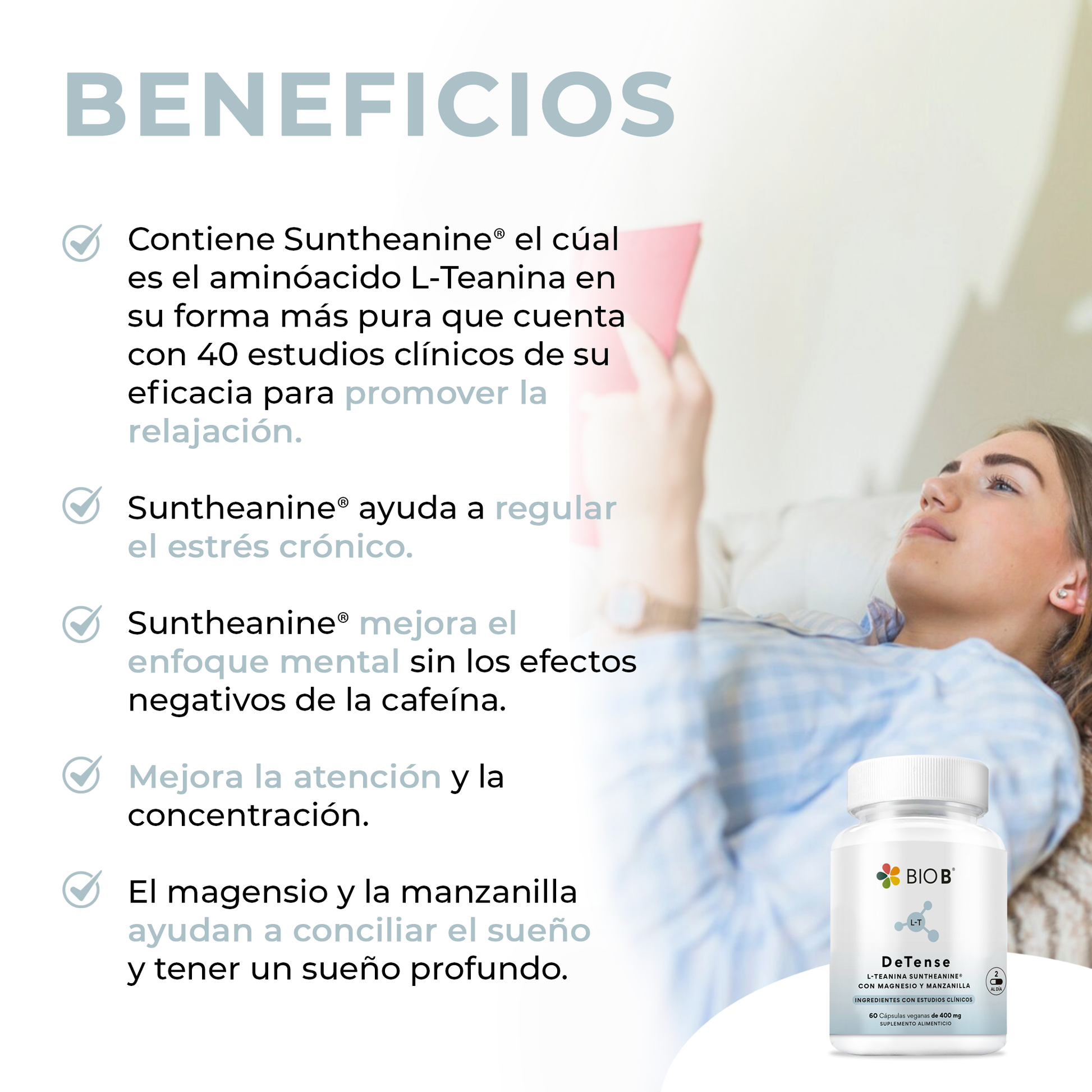 - Contiene Suntheanine®, la forma más pura y estudiada del aminoácido L-Teanina, para promover la relajación.