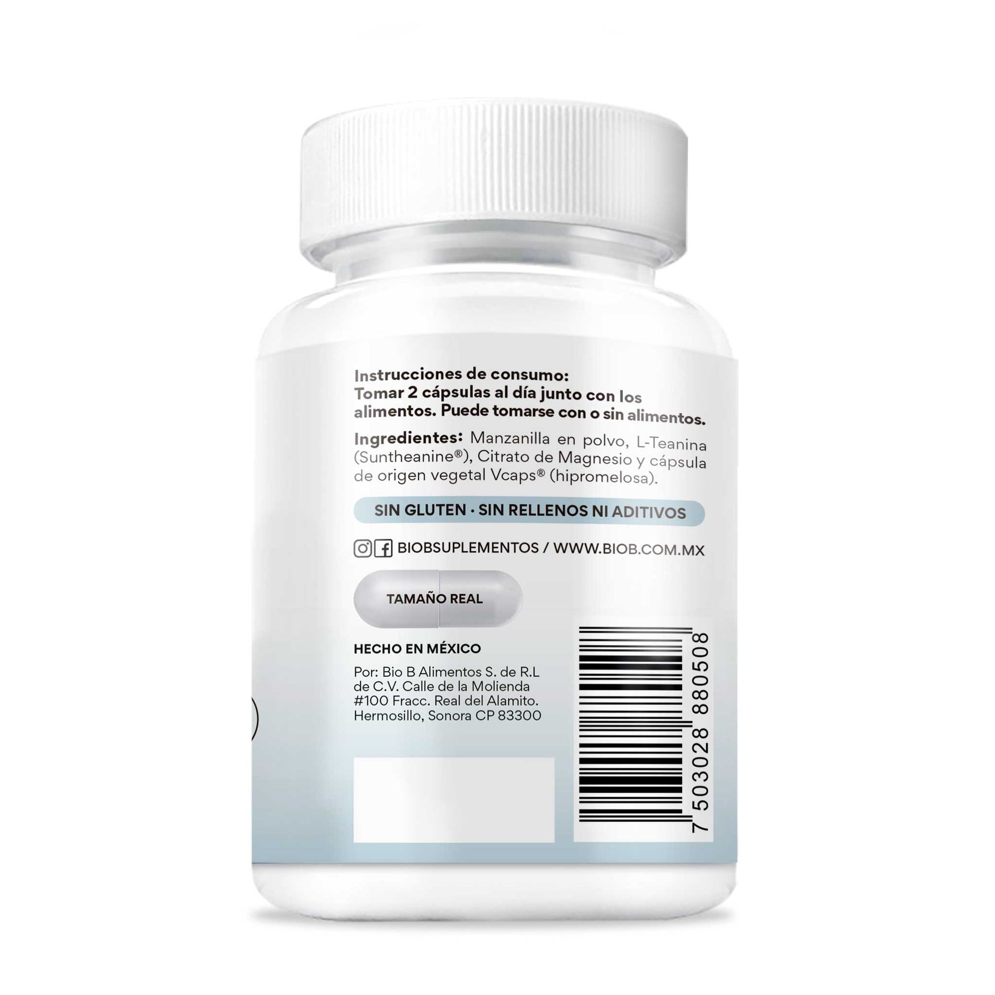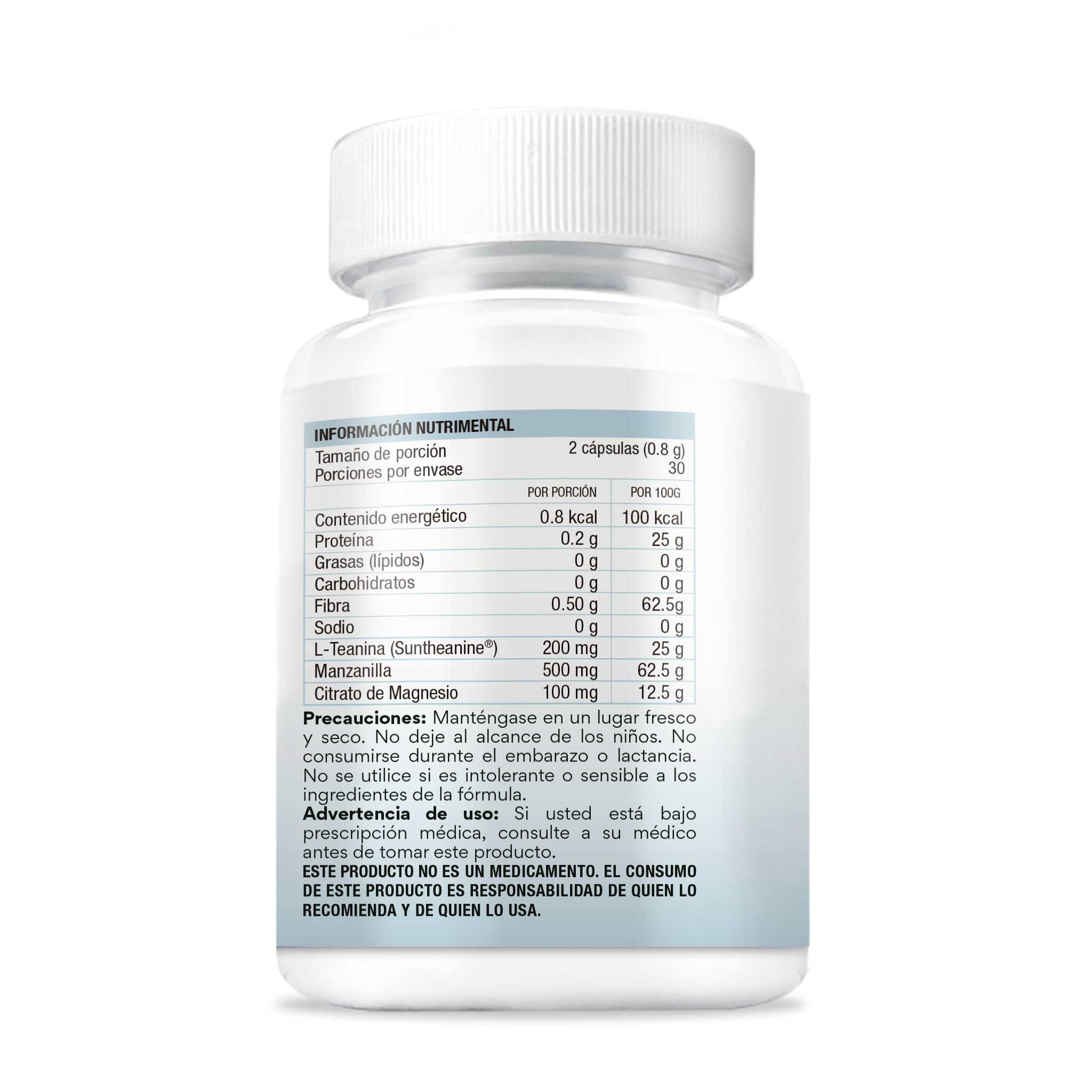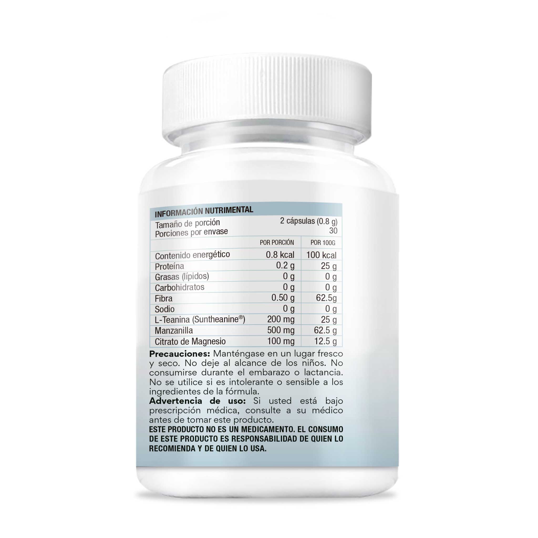 Manzanilla en polvo, L-Teanina (Suntheanine®), Citrato de Magnesio y cápsula de origen vegetal Vcaps® (hipromelosa).