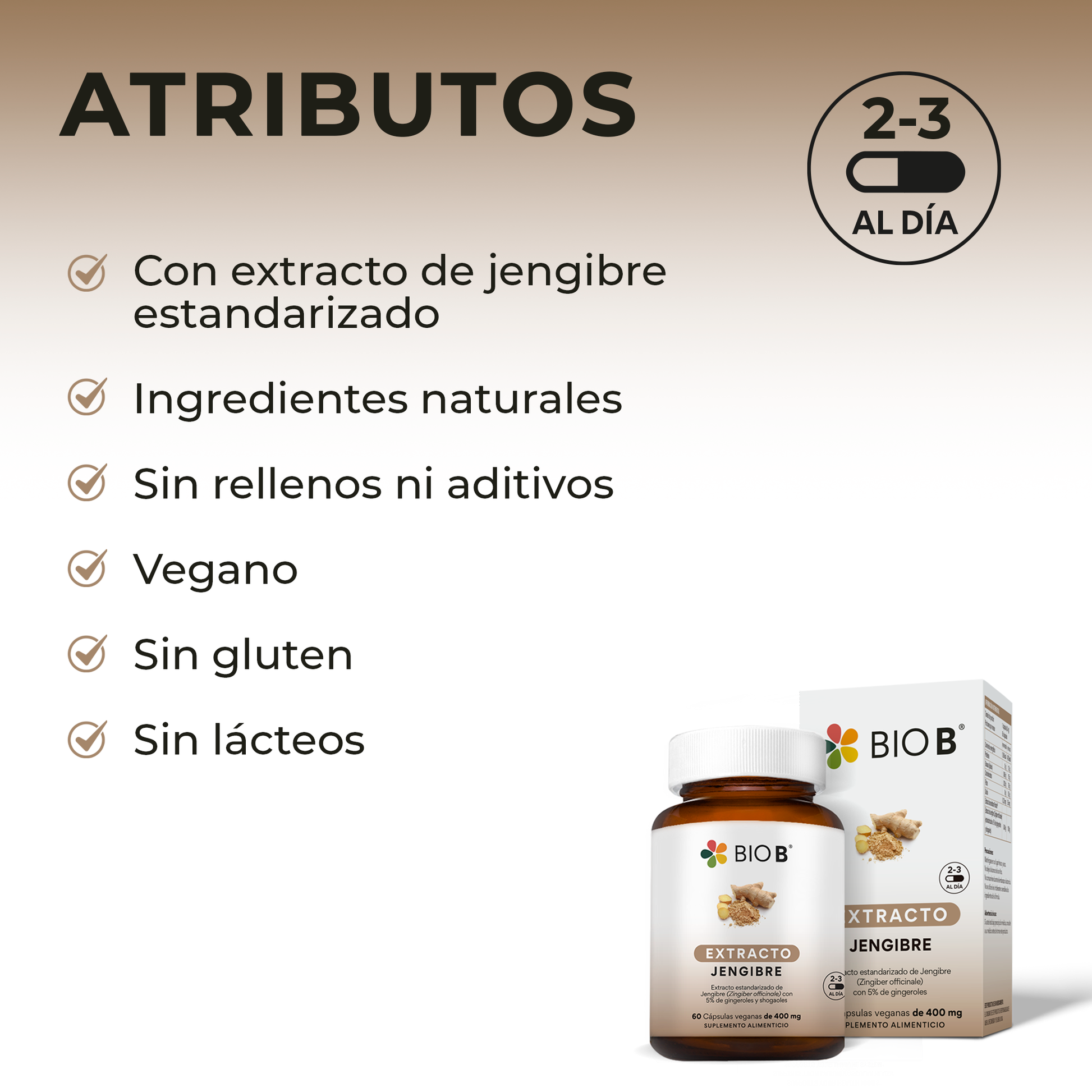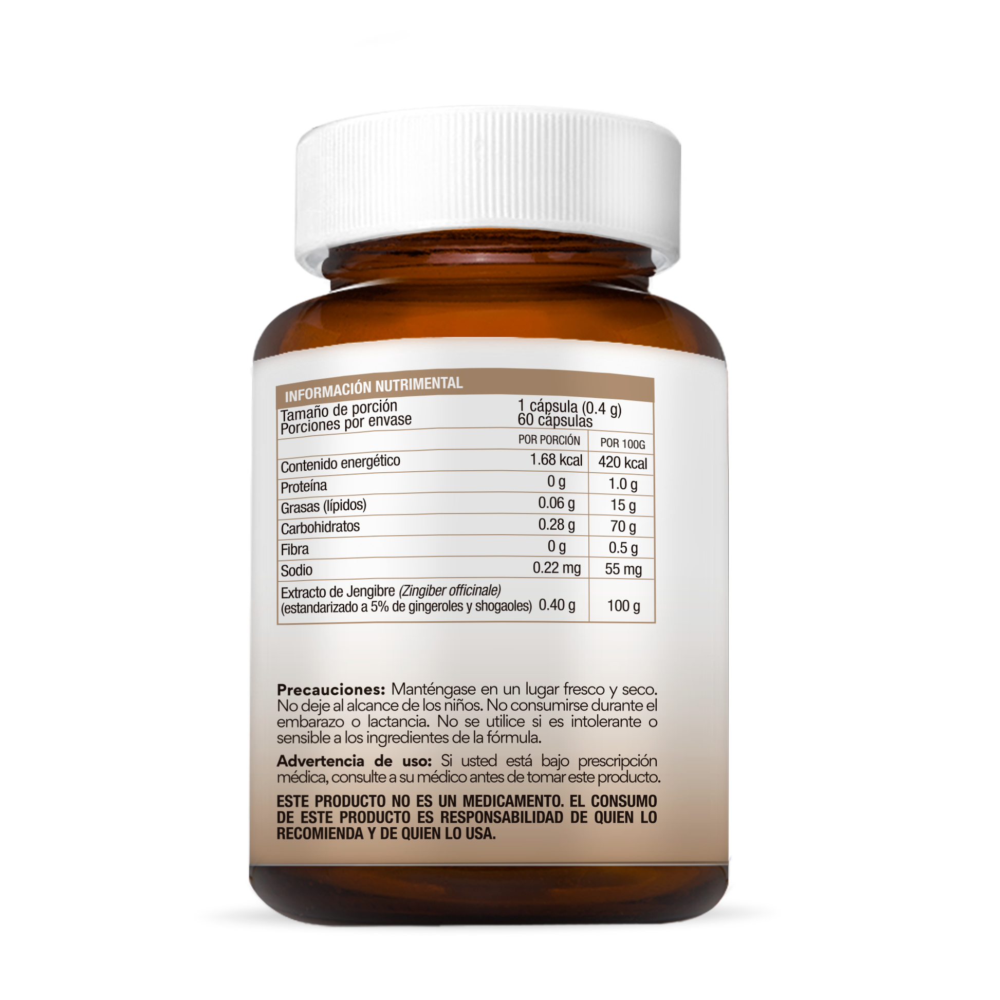 Extracto de jengibre (Zingiber officinale) (estandarizado a 5% de gingeroles y shogaoles) y cápsula de origen vegetal Vcaps® (hipromelosa).
