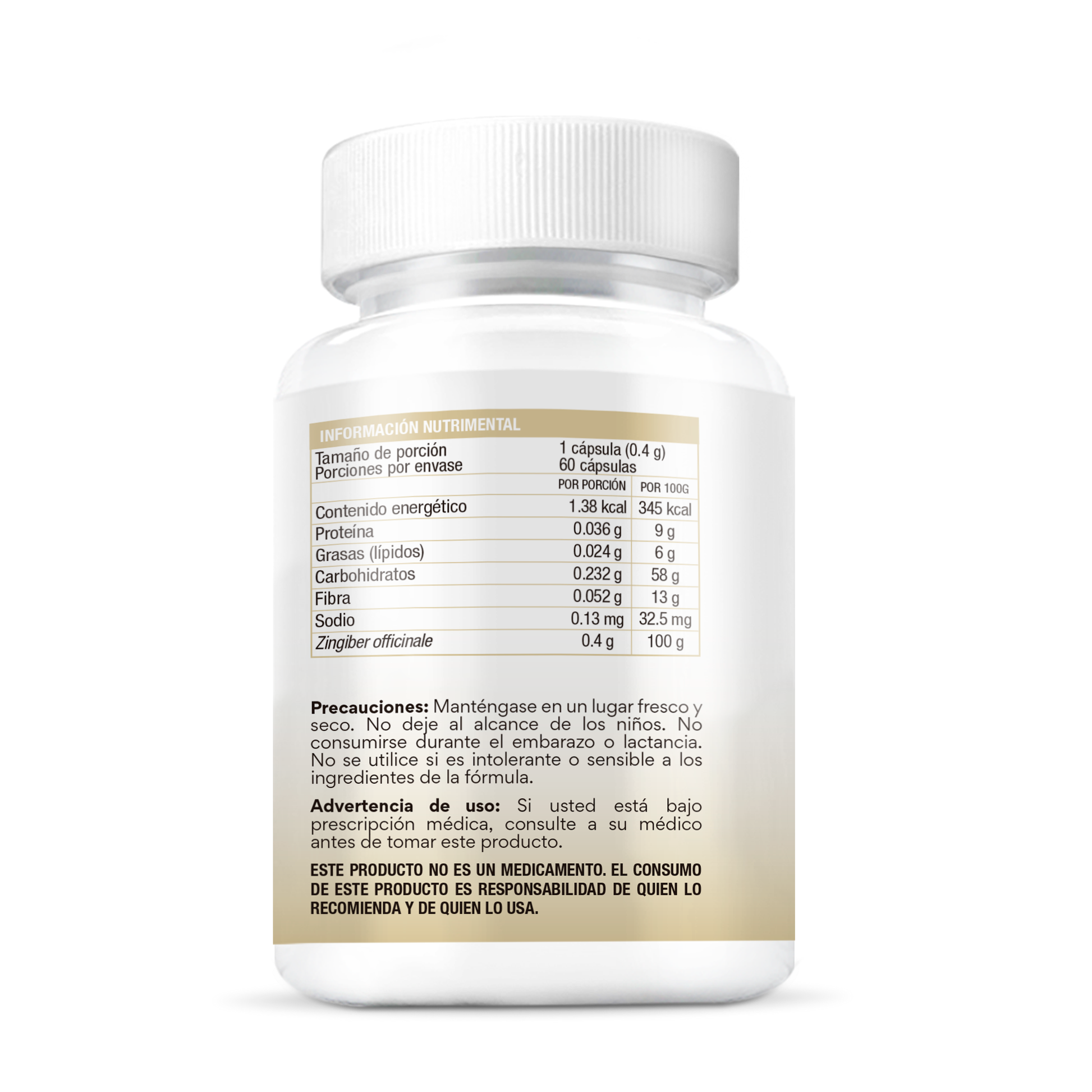 Raíz de jengibre en polvo (Zingiber officinale) y cápsula de origen vegetal Vcaps® (hipromelosa).
