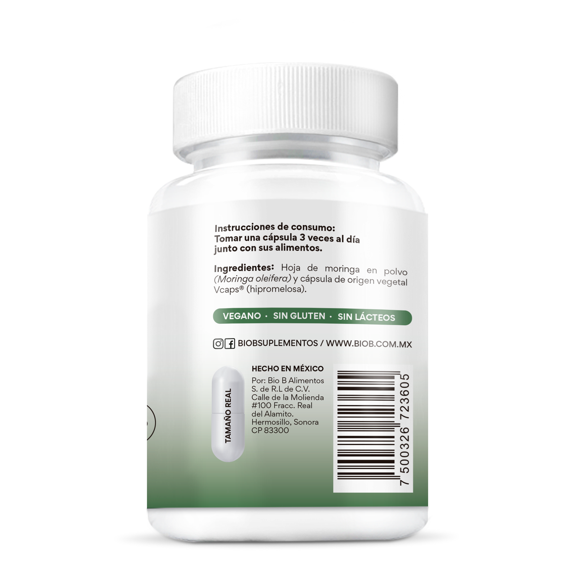 Hoja de moringa en polvo (Moringa oleifera) y cápsula de origen vegetal Vcaps® (hipromelosa).