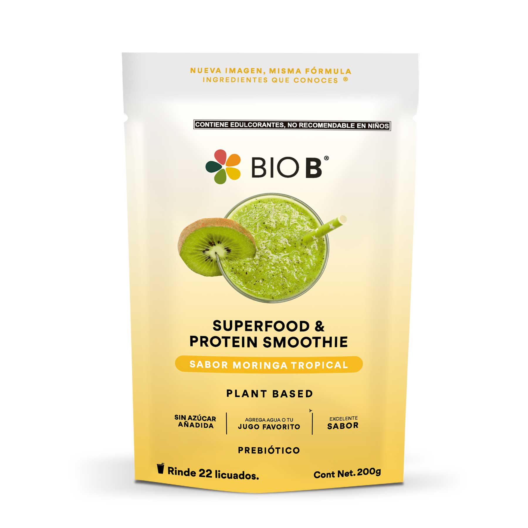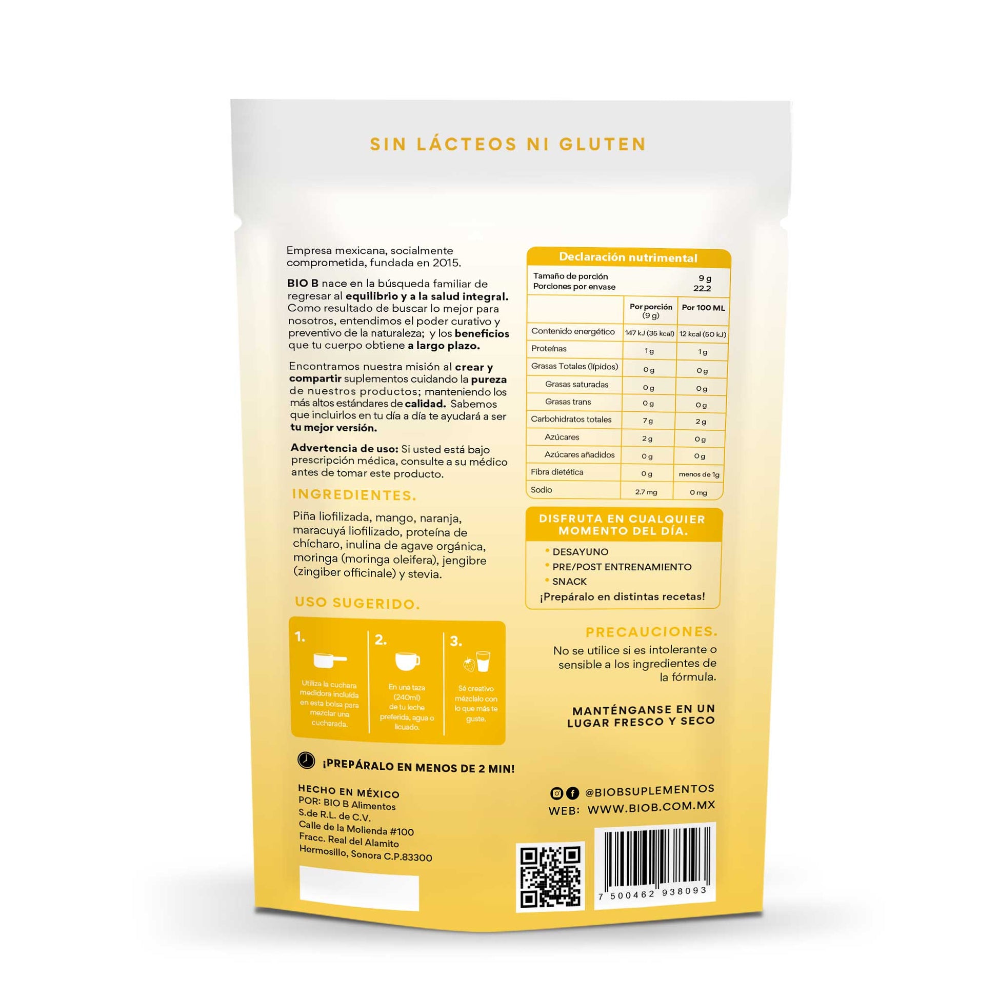 Piña liofilizada, mango, naranja, maracuyá liofilizado, proteína de chícharo, inulina de agave orgánica, moringa (moringa oleifera), jengibre (zingiber officinale) y stevia.