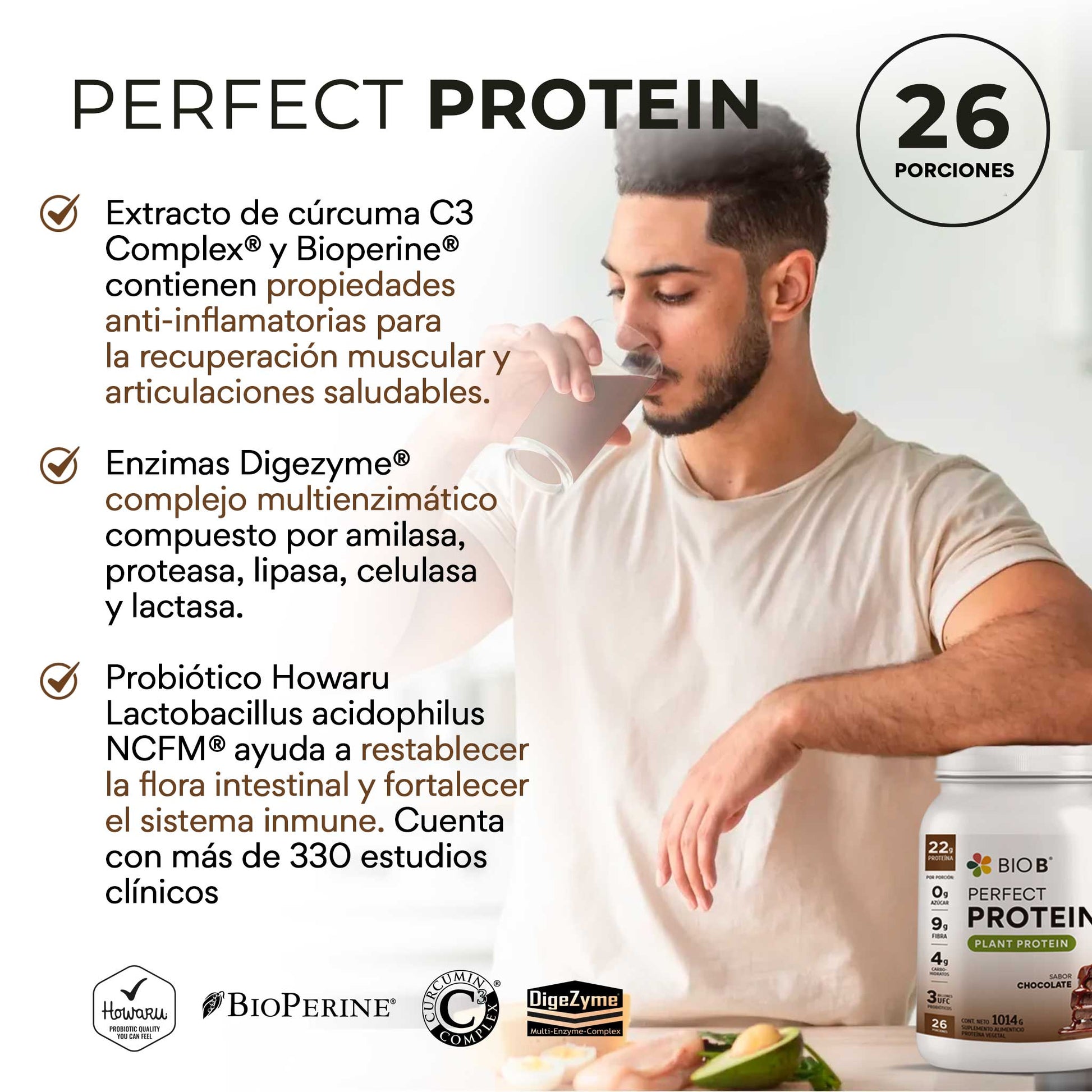 Mezcla de proteínas (proteína de chícharo, proteína de semilla de linaza y proteína de semilla de chía), inulina de achicoria, cocoa, saborizantes naturales, mezcla de gomas (arábica, xantana y guar), probiótico (Lactobacillus acidophilus NCFM®), extracto de cúrcuma Curcumin C3 Complex® y Bioperine®, fruto del Monje, mezcla de enzimas digestivas Digezyme® y stevia. Contiene 0.1 g de stevia en 100 g de producto.