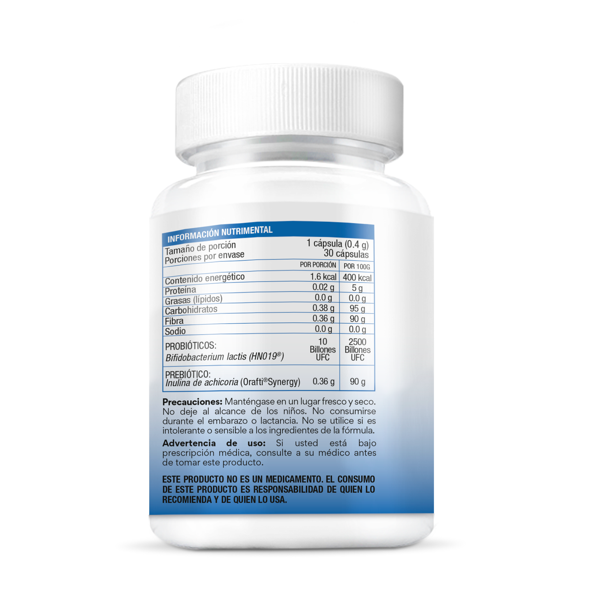 Bifidobacterium Lactis (HN019®), Inulina de achicoria (Orafti®Synergy) y cápsula de origen vegetal Vcaps® (hipromelosa).