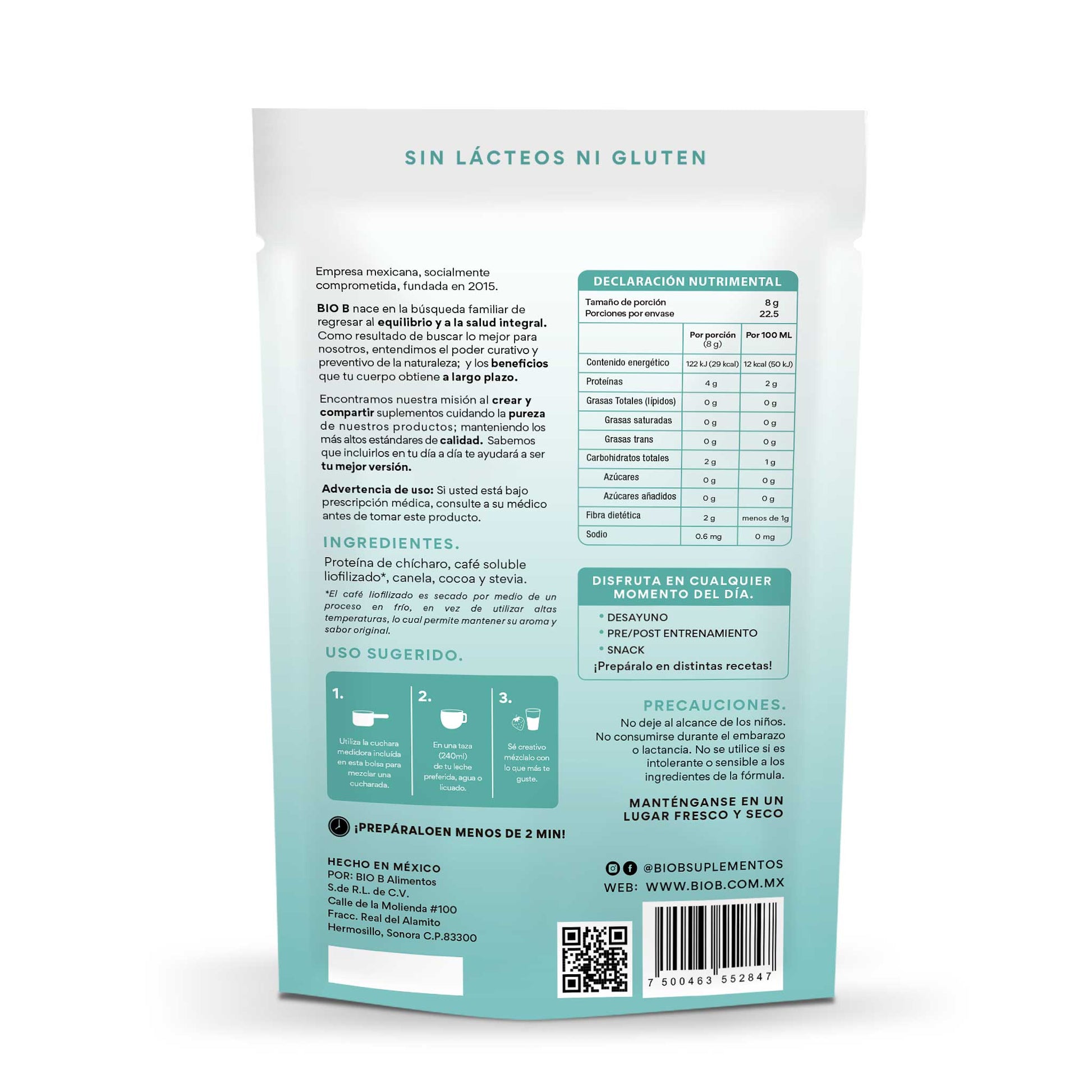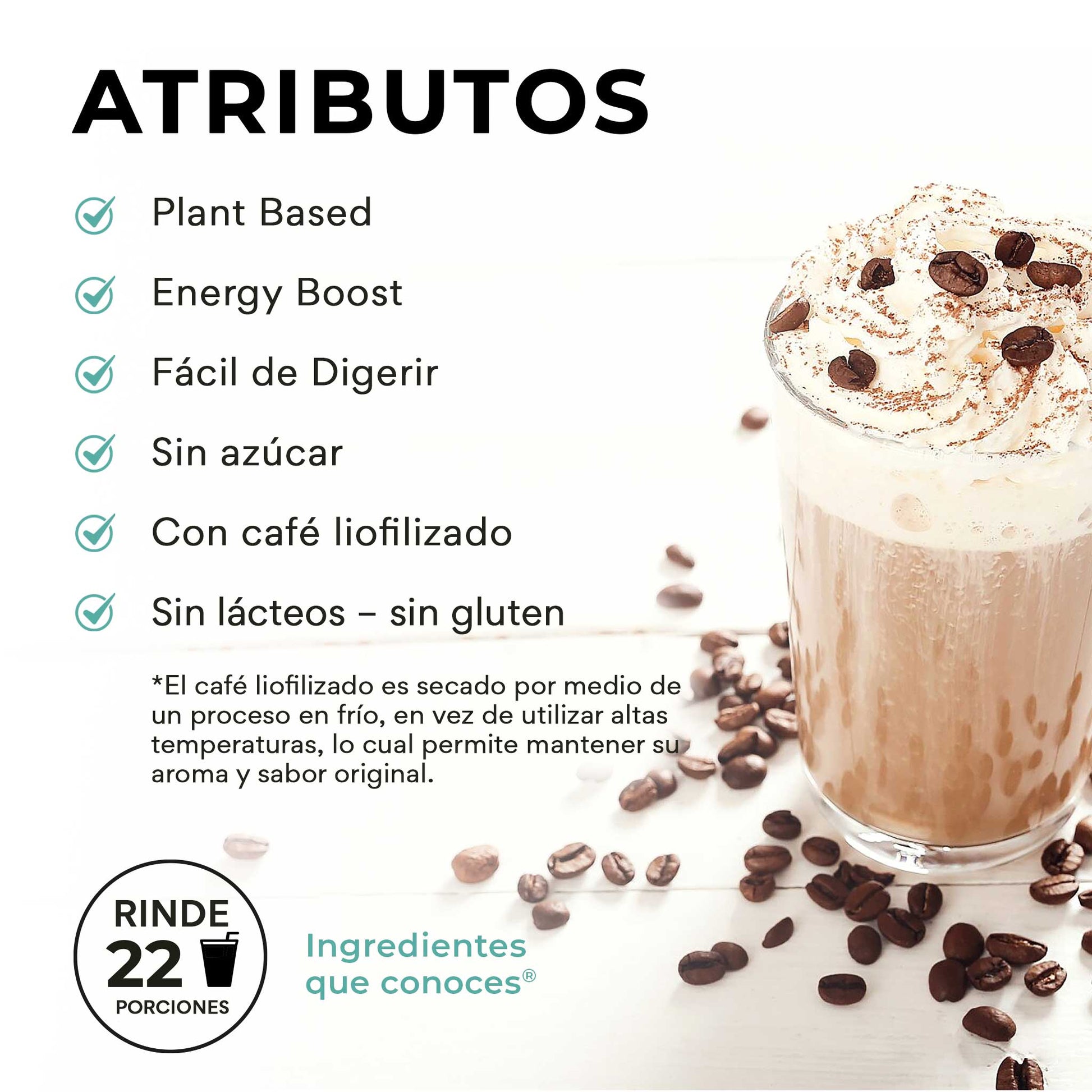 Proteína de chícharo, café soluble liofilizado*, canela, cocoa y stevia.