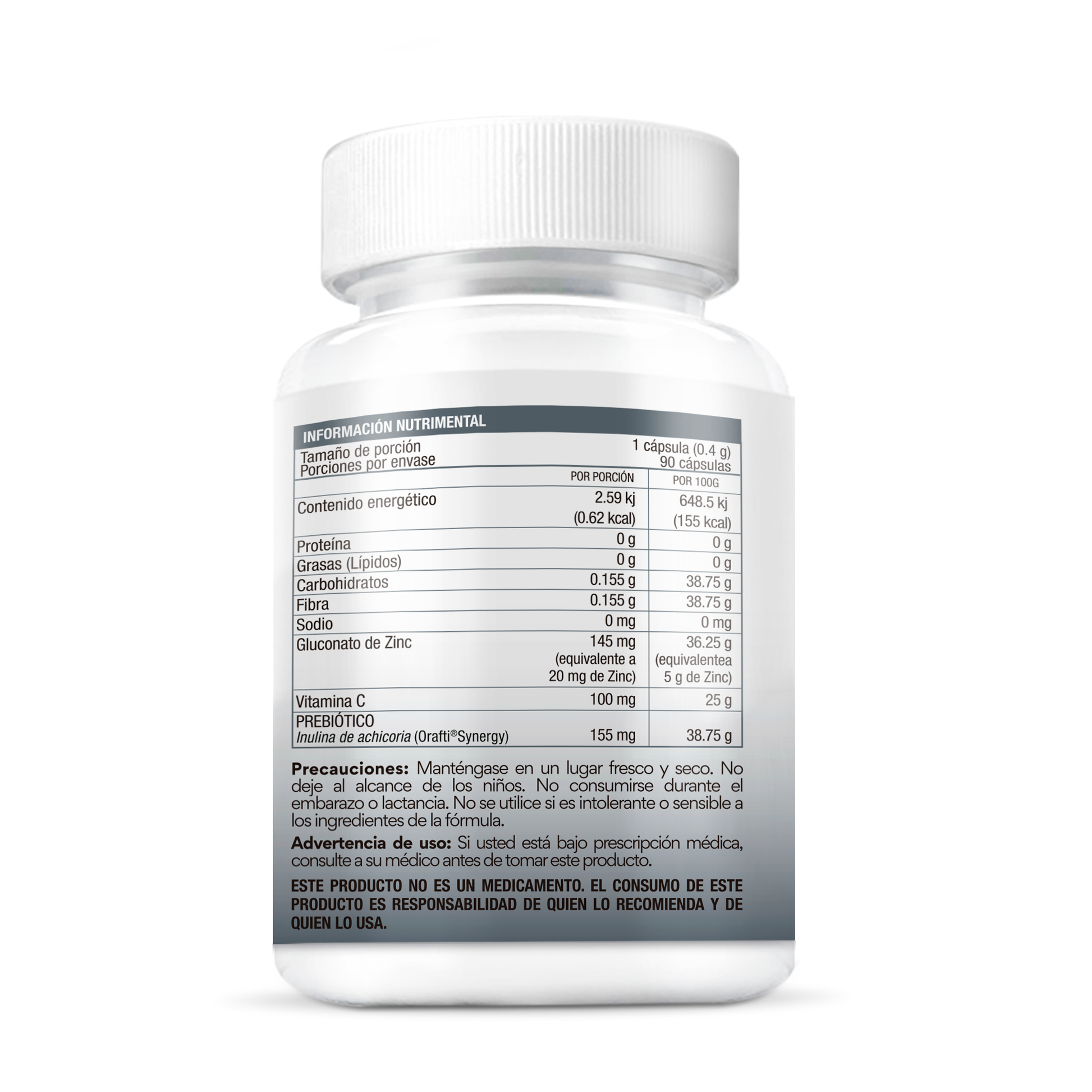 Con Prebiótico Orafti Synergy® Ingredientes: Inulina de achicoria (Orafti® Synergy), gluconato de zinc, vitamina C (ácido ascórbico) y cápsula de origen vegetal Vcaps® (hipromelosa).